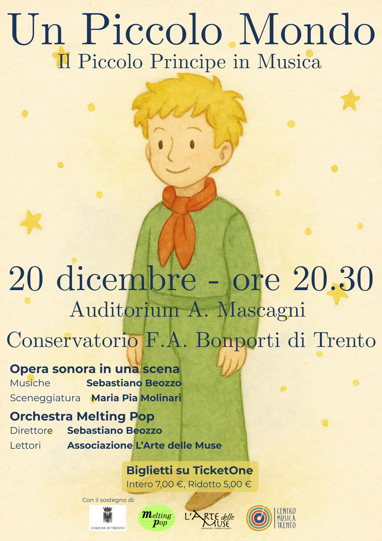 L’associazione Melting Pop, in collaborazione con l’associazione filodrammatica Arte delle Muse e il Centro Musica di Trento, porta in scena “Un Piccolo Mondo” il 20 dicembre alle 20.30 all’Auditorium A. Mascagni del Conservatorio F.A. Bonporti di Trento.