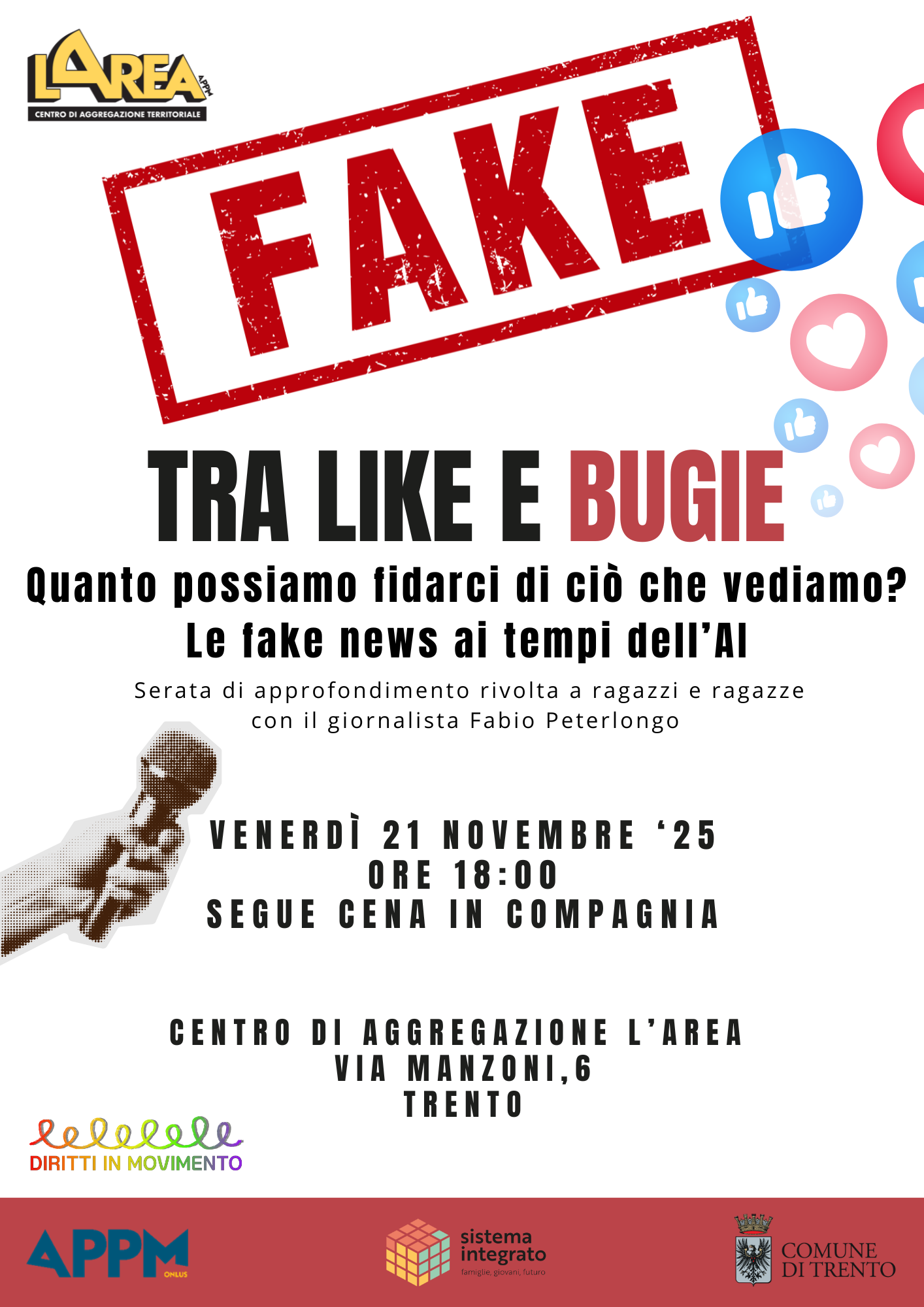 - Tra like e bugie: quanto possiamo fidarci di ciò che leggiamo — Serata di sensibilizzazione sulle fake news con il giornalista Fabio Perterlongo, a seguire cena condivisa con educatrici ed educatori dell’Area.