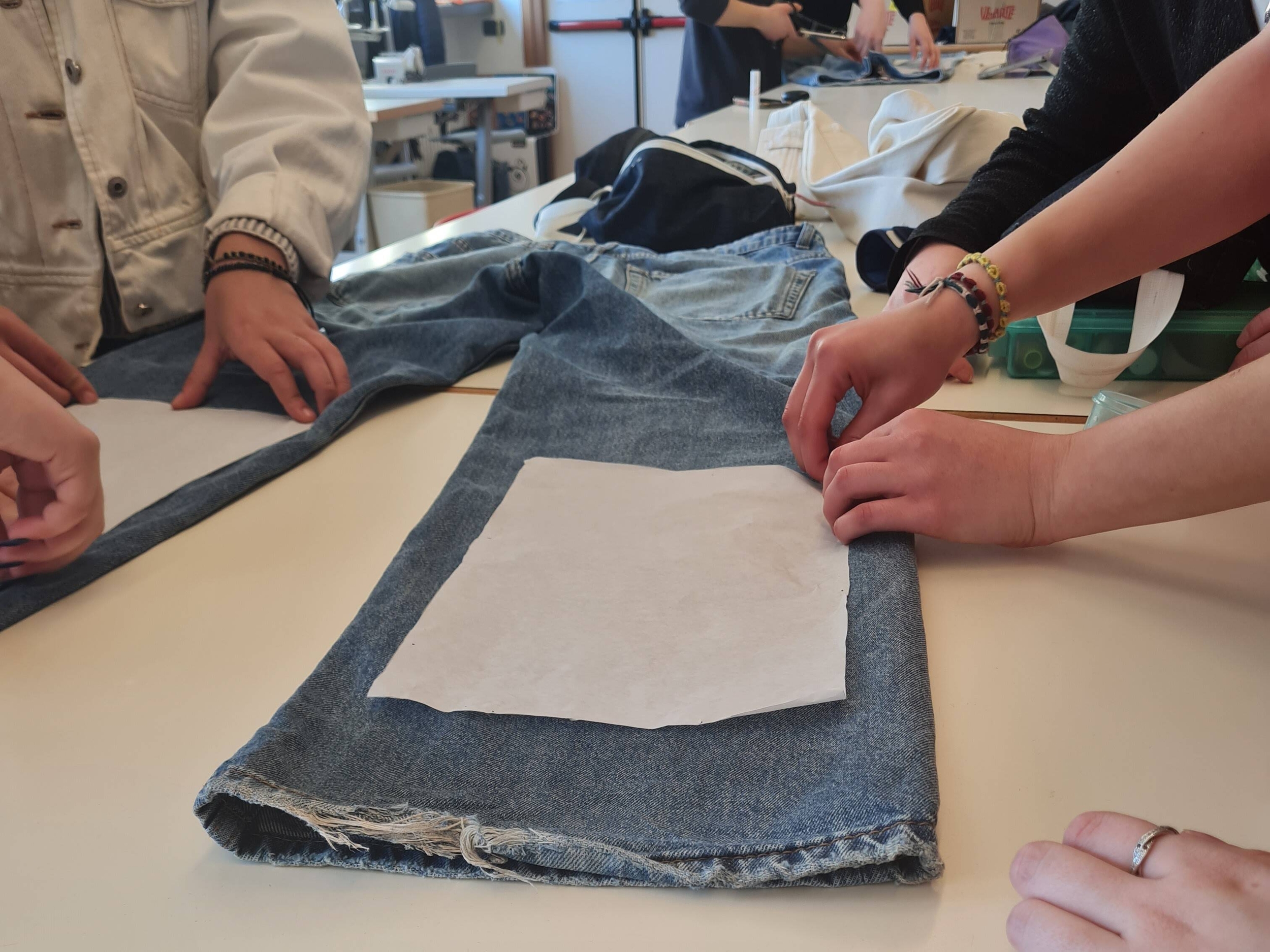Il laboratorio di questa mattina consisteva nel riciclo di vecchi jeans portati dallə studentə per creare dei nuovi astucci. Ad insegnare il procedimento erano le ragazze stesse.